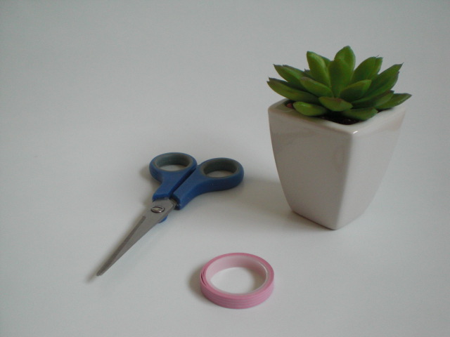 Voor de eerste DIY heb ik bij de Action dunne washi tape gekocht (€ 0,79 voor 6 rolletjes) en 2 vetplantjes (€ 1,35 per stuk). Bij elkaar opgeteld ben je voor deze DIY nog niet eens € 4 kwijt! Goed, laten we beginnen. Eerst nog even een foto van wat je nodig hebt: de washi tape, de plantjes en een schaar.